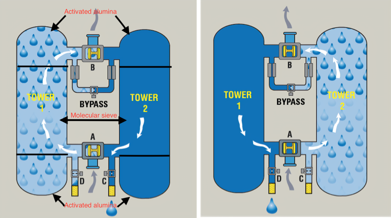 Adsorption air dryers use desiccant materials to adsorb moisture from compressed air, ensuring dry and clean air for critical applications where low dew points are required.